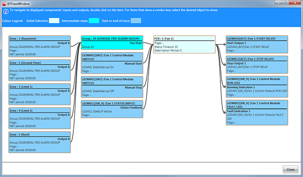 Our engineer imported the config file into FireUtils, selected the relevant line in the “Outputs” table and opened the flow-chart-like IOTrace display. This showed that a fault relay had been mapped to a group that was, in turn, configured to activate an output that communicated an alarm over the network to panel number 4. Because of the configuration error, a fault on panel 2 would trigger an alarm at panel 4.