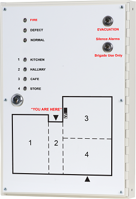 Our new Small Slim LED Mimic provides remote control and display for fire alarm systems with up to eight zones. Available in Front-Service (SLCABSMFS) and Rear-Service (SLCABSMRS) models, the new mimic has eight zone Alarm LEDs, plus Normal, Fire, Sprinkler, and Defect LEDs. The 350 mm x 245 mm cabinet fits into places that are too small for F16e or F100A panels. The LED mimic needs only one RS485 cable from the host panel: Very unobtrusive when the mimic has to go in a place that can’t be cluttered with lots of cable.